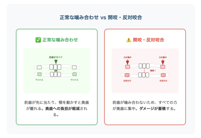 しかし、開咬や反対咬合では、この前歯による「守り」が働きません。その結果、噛む力、歯ぎしり、食いしばりのすべてが、無防備な奥歯に直接かかってしまうのです。