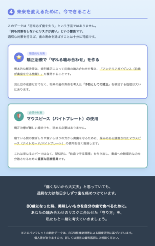 東北大学の研究チームも「矯正歯科治療が歯の喪失予防や健康寿命の延伸につながる可能性」を指摘しています。つまり、リスクを知った上で適切に対処すれば、未来は変えられるのです。
