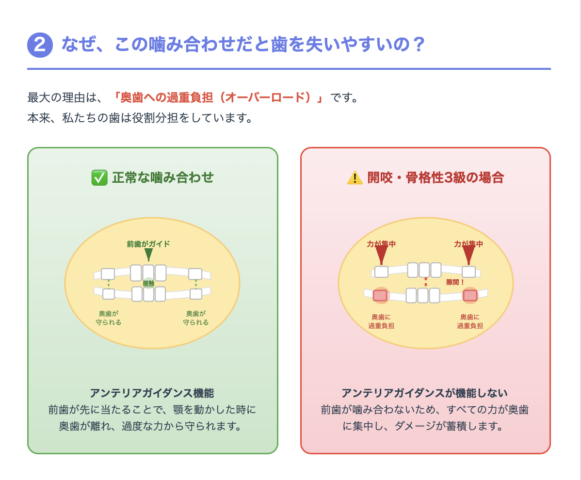 - 原因は「アンテリアガイダンス」が機能せず、奥歯に過重負担がかかること