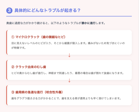 奥歯に過度な力がかかり続けると、以下のようなトラブルが静かに、しかし確実に進行していきます。