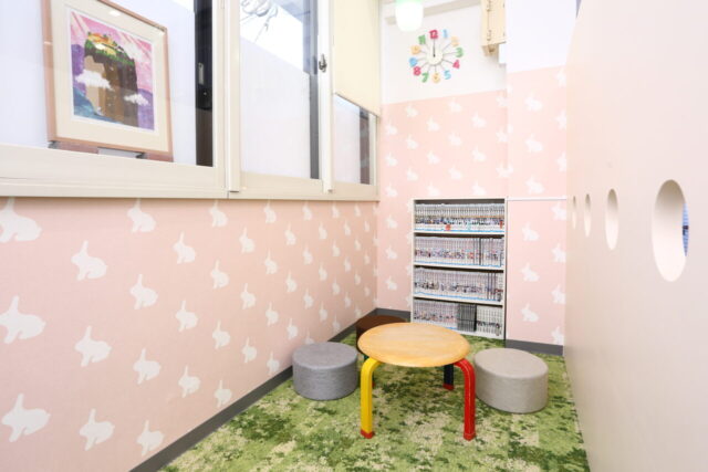 以前より少しコンパクトになりましたが、可愛らしいうさぎ柄の壁紙と、お子さまサイズのテーブル・椅子をご用意しました。待合室と一体化した開放的な空間で、親御さんの目が届きやすい設計になっています。