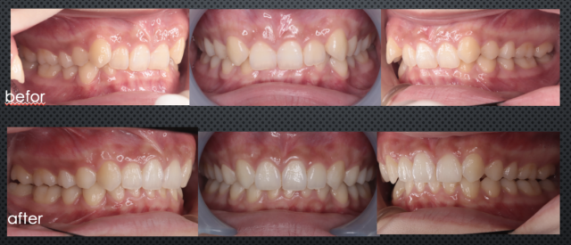 前歯の噛み込み「Over Bite」が深すぎて、下の歯が全く見えない状態でした。左上の犬歯が飛び足しており、口元も非常に目立っていました。