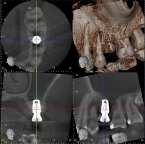 抜歯後3ヶ月待ってインプラント治療を行いました。青色がインプラントシミュレーションとなります。上顎洞底までの距離が短いため注意が必要な症例です。