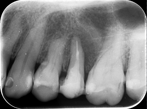 歯根を取り囲むような黒い影があり、歯根破折を強く疑います。